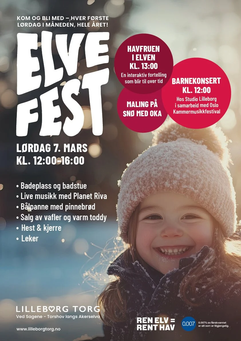 Lørdag 7. mars kl. 12–16 blir det elvebad og badstue, live musikk, bål med pinnebrød, vafler og varm toddy, leker for barna, maling på snø, Havfruen i elven og hest & kjerre. + mye mer….