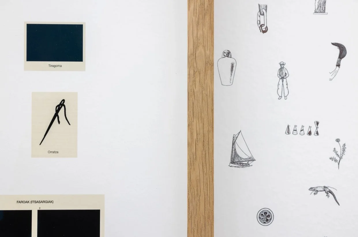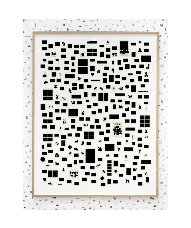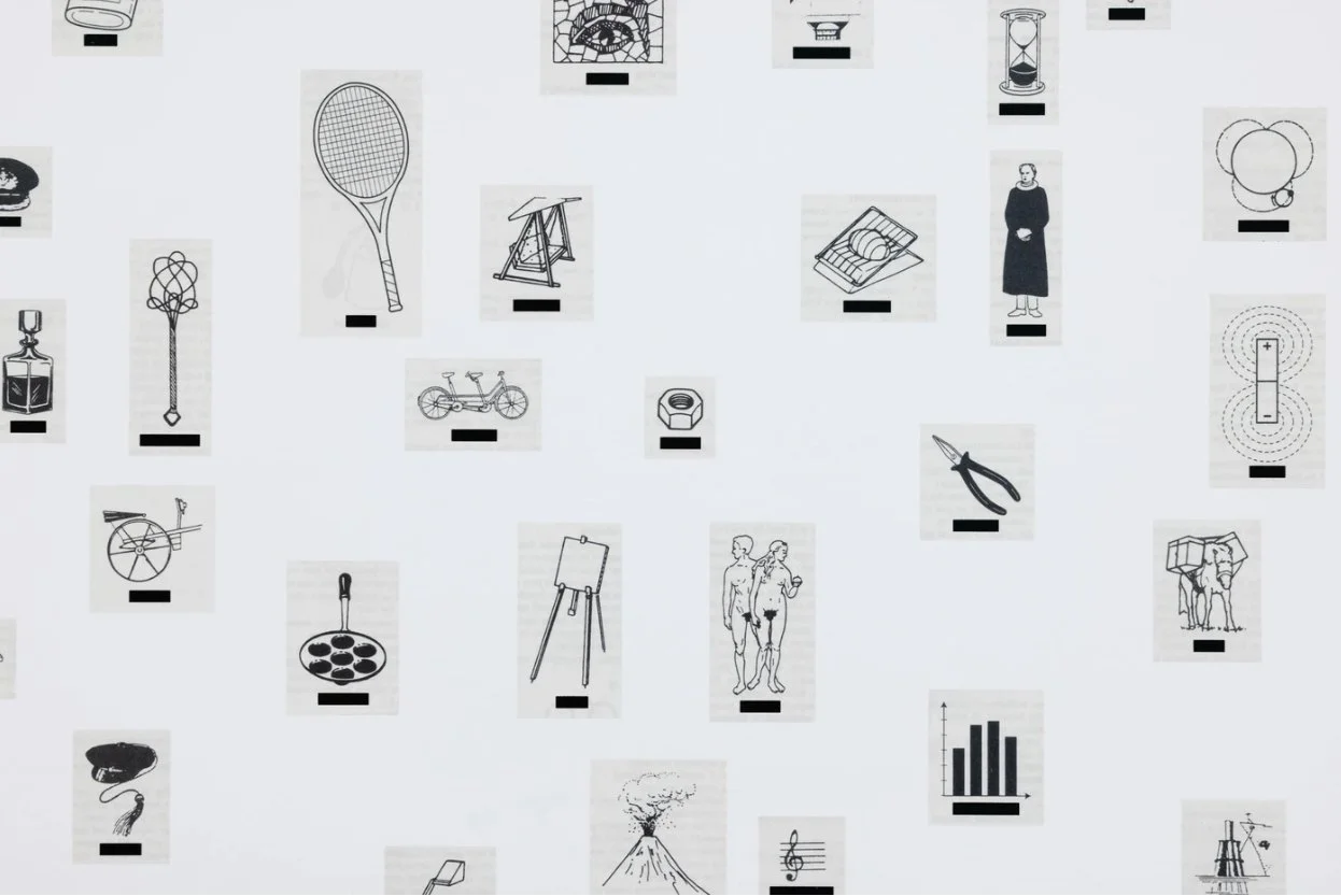 In an ongoing series of works, Tan reproduces all the images that come to the explanatory aid of words in the dictionary of a given language. Not all words require visual support, but the dictionary’s editors estimate that certain tools, ships and objects related to war need help, a supplement. These decisions, as well as the style of illustration, are highly specific to the language in question. In the case of the Basque dictionary, for example, there are 264 illustrated words, while in the Norwegian language there are just over 1000. Tan reproduces these 1000 images in diptych format: one print collects and then renders them as silhouettes labeled with the term they are meant to help explain, while the other print shows the pictures but redacts the words. The viewer is never granted a seamless transition between word and image. One part of meaning is always withheld.