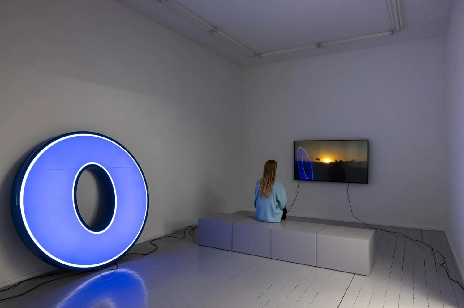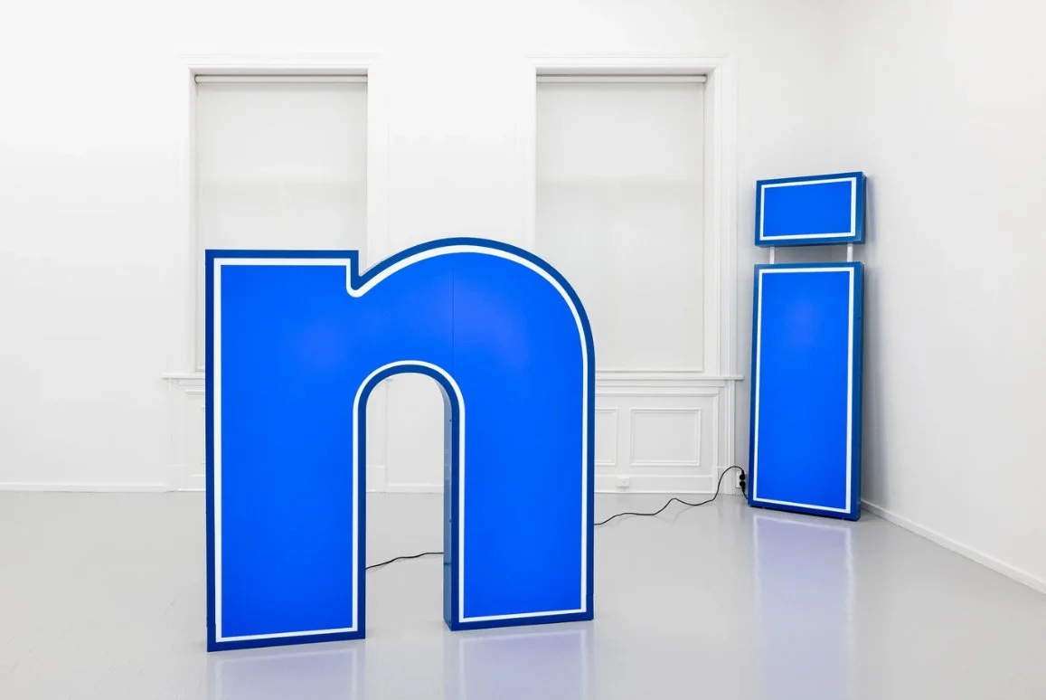 There is a large luminescent sign placed high over a bridge facing the suburbs of Stockholm, which I biked toward for years in the dark grey of winter mornings on my way to teach in the city center. Tan had the sign duplicated and then deconstructed it at its original scale for her installation Pa (2023), which gives this exhibition its elusive title. The giant letters are scattered throughout the exhibition space like unmoored beacons for a place that is lost.
