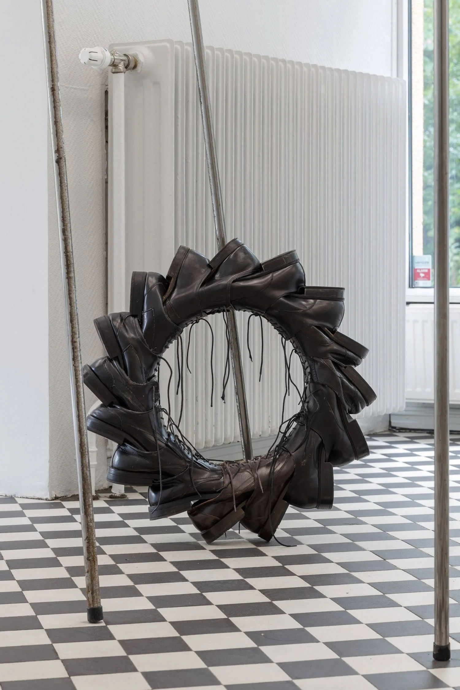 This cyclical movement continues in sculptures made from men’s leather dress shoes, pressed together to form wheels, suggesting power spinning endlessly, trapped in its own motion—a metaphor for capitalism and the hamster wheel of modern life.