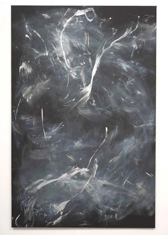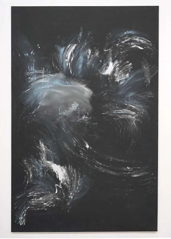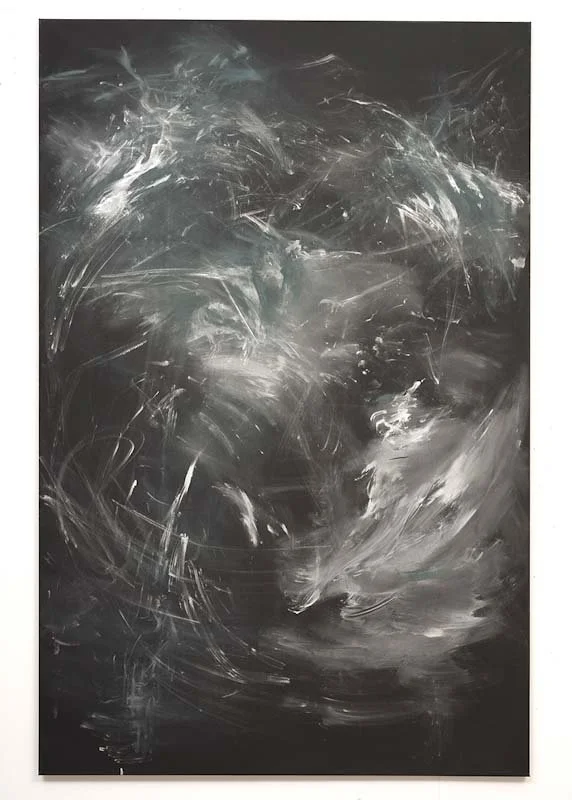 I serien Eclipse er maleriet en koreografi av bevegelse og stillstand, en veksling mellom lys og mørke, form og oppløsning. Gjennom sjablonger, gester og flytende lag avlakk skapes et billedspråk som både tildekker og avdekker, lik en solformørkelse der det skjulte kun anes i randsonene. Overflaten bærer spor av handling – raske strøk,kontrollerte avsetninger, glidende overganger – som en slags visuell pust, en rytme mellom tilsynekomst og forsvinning.