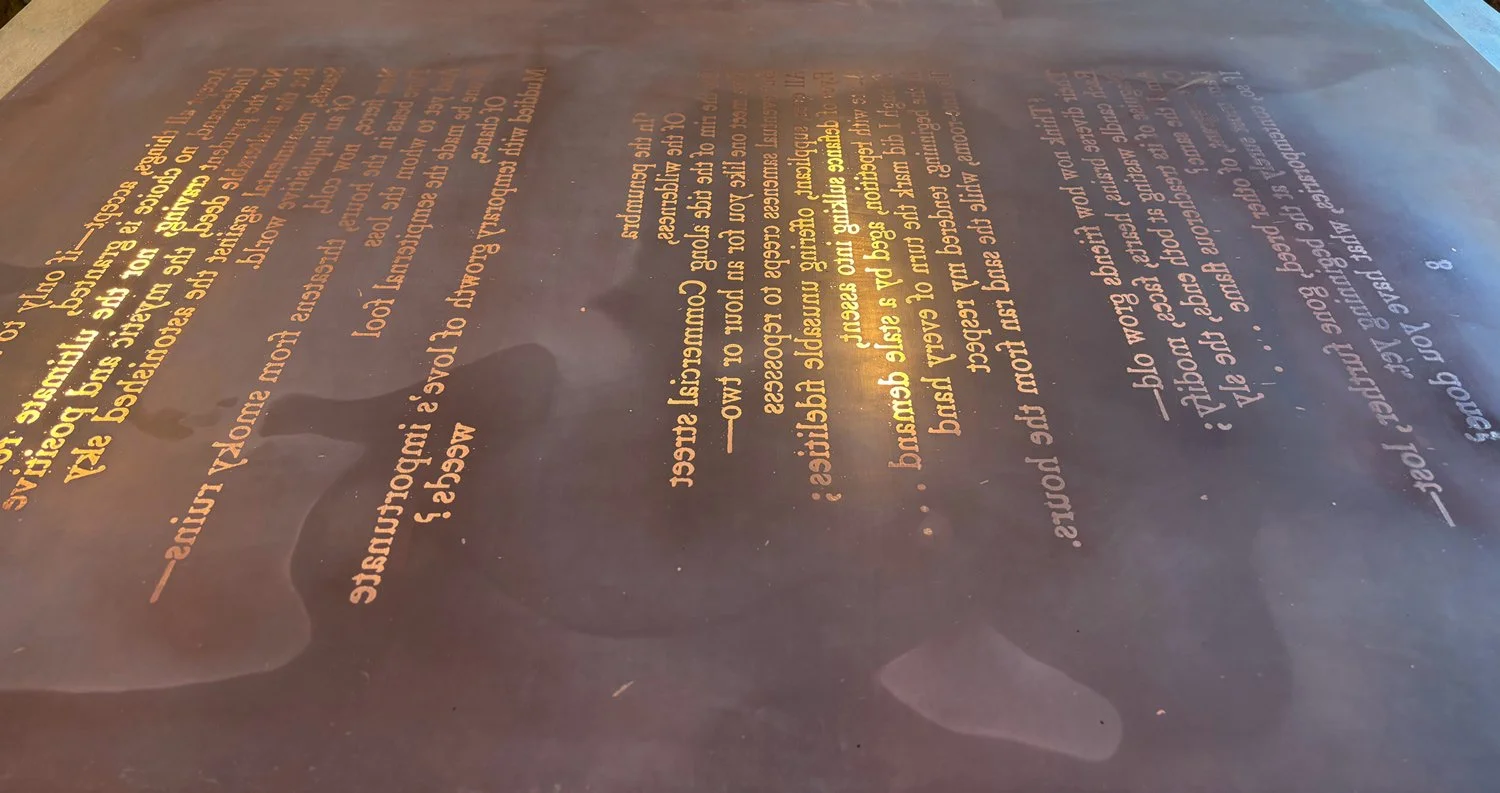 Der historien har forsøkt å vaske bort Cunards ord og omgi dem med svertekampanjer, søker Ane Thon Knutsen å reversere denne prosessen: Hun henter frem Cunards ord ved å omgi dem med sverte. Mer spesifikt har hun scannet hele originalen av Parallax, blåst opp hver enkelt av sidene og UV-printet dem på store kobberplater. Deretter har hun etset og trykket dem på 21 meter-høye ark. Denne teknikken får sverten til å legge seg rundt bokstavene i stedet for på dem, slik tradisjonell boktrykk gjør. Prosessen er på flere måter en reversering av boktrykkens logikk. I boktrykk blir ordene demontert og sortert som enkeltbokstaver så fort de har fullført sitt oppdrag. I etsningen derimot, blir ordene en integrert del av metallet. Knutsen har valgt å trykke ordene i store format, nærmest monumentale, slik at utstillingen blir til en romlig bok en kan bevege seg i, et kart over et litterært landskap der skyggene rundt bokstavenes forhøyninger definerer dem. Med dette utstillingsprosjektet inviterer Knutsen publikum til å oppleve Cunards underkjente arbeid, men også til å diskutere viktigheten av de materielle og grafiske forutsetningene rundt publisering – både i dag og gjennom tidene.