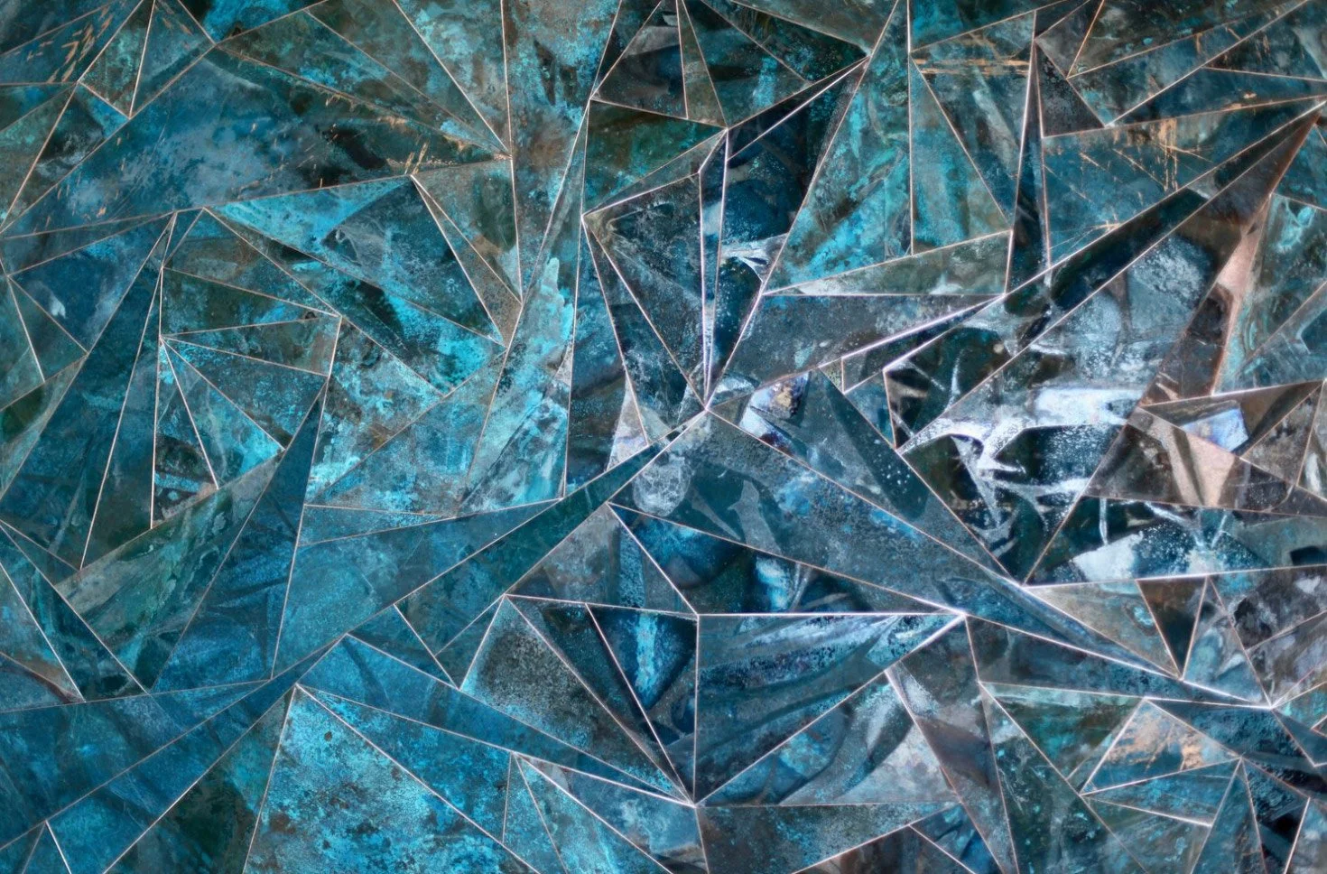 Through a distinct geometric language of unfolding triangles, Solberg explores the notion of Circadian Rhythms—unseen cycles that shape both our physical presence and mental landscapes. Her works reflect these natural fluctuations through structured repetition, measured interruptions, and shifts in materiality. Copper and brass, patinated with simple household substances, bear the marks of time, temperature, and handling. Hues of green, blue, and turquoise emerge across the surfaces in a painterly manner, revealing the quiet passage of transformation.