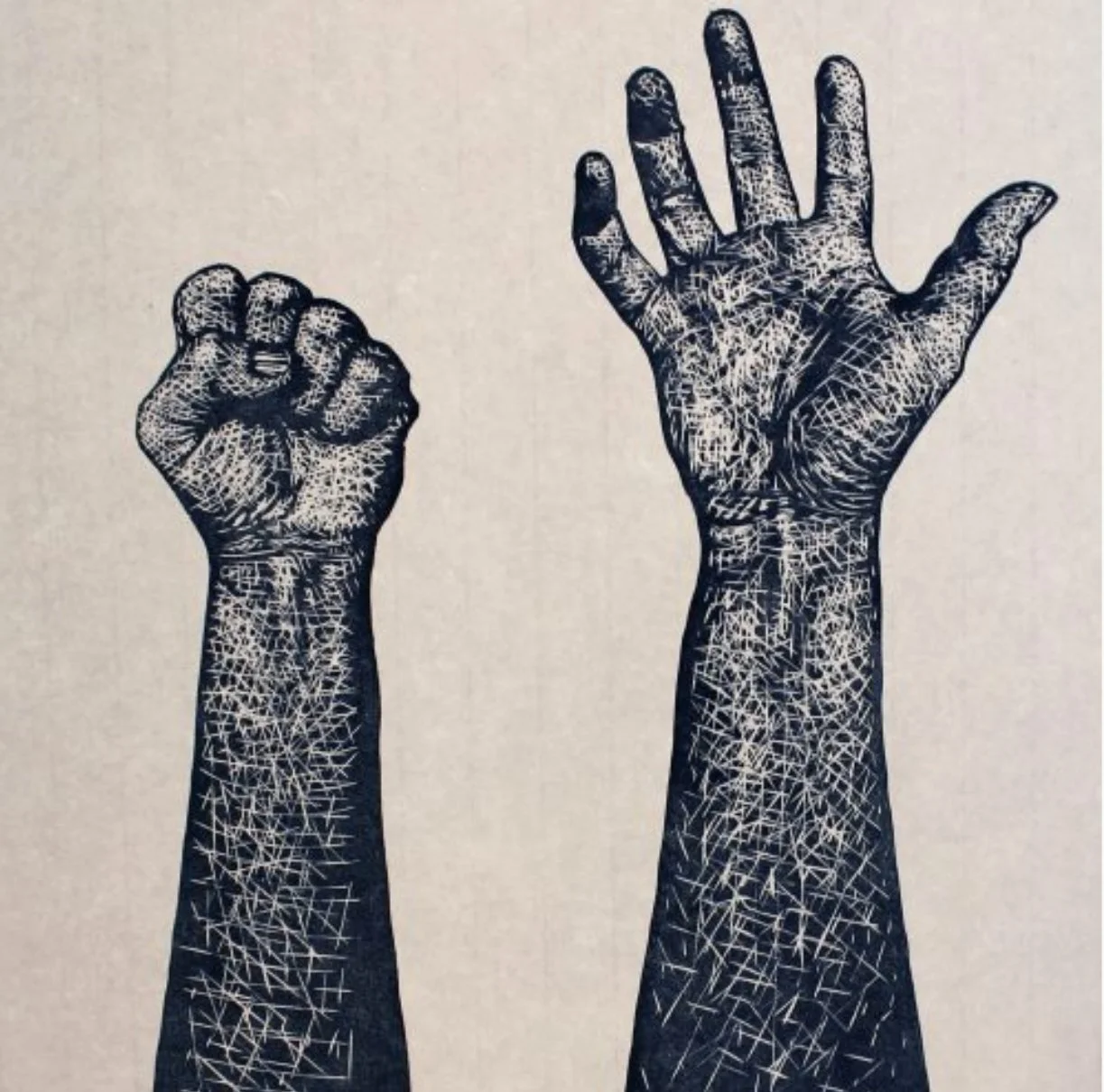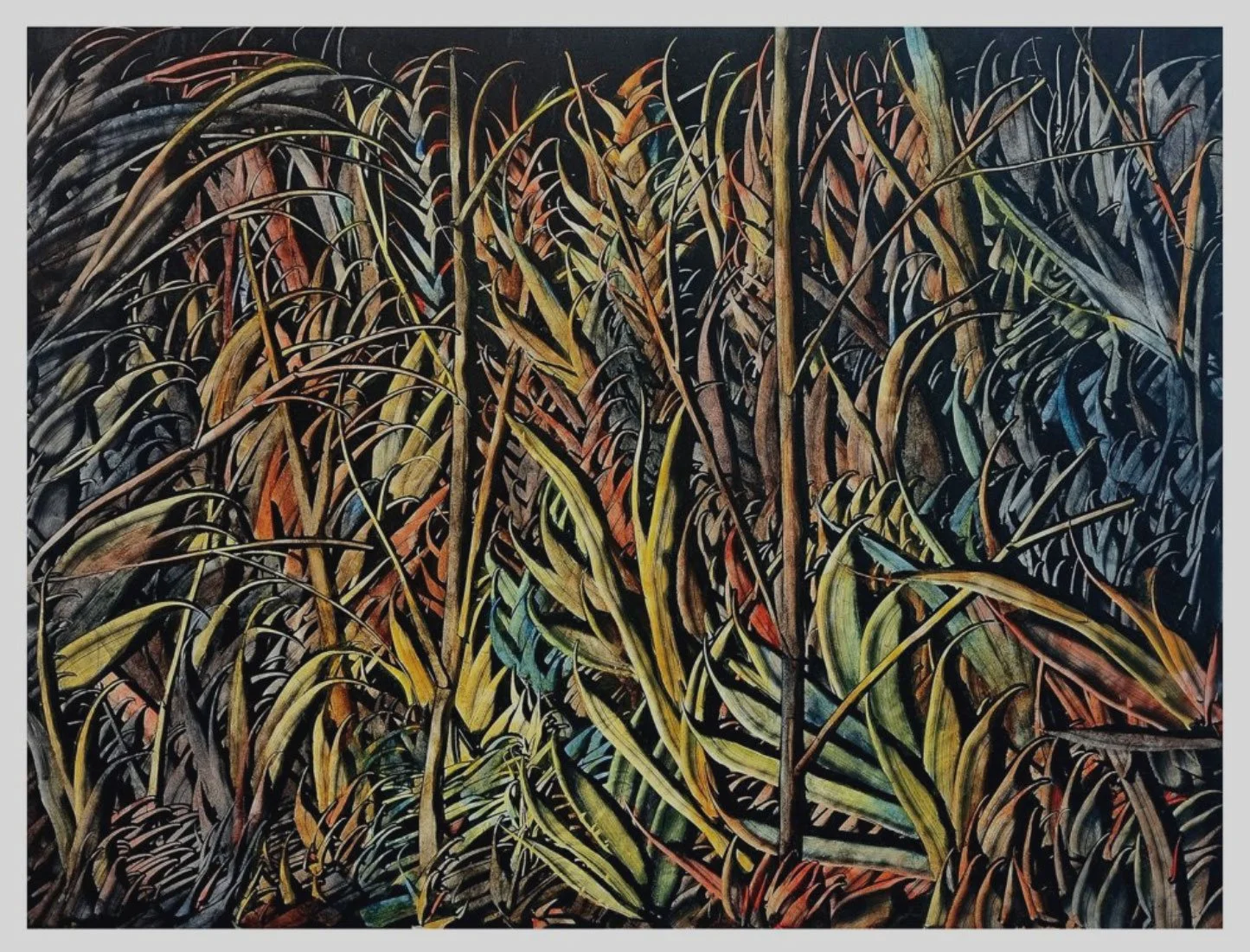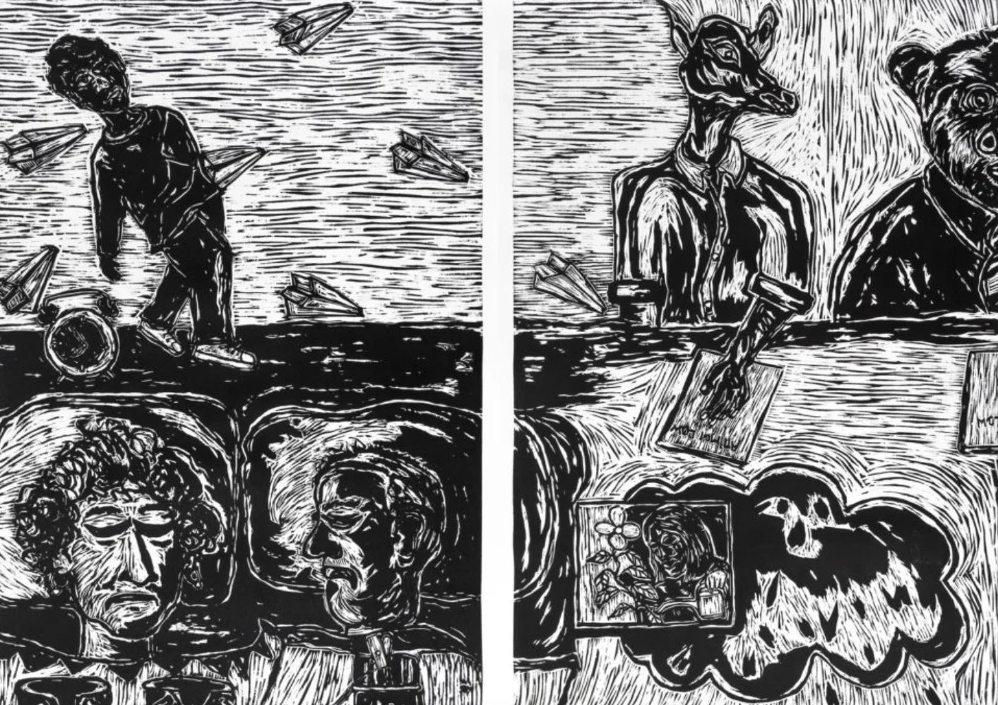Svensen stiller ut tresnittet Under overflaten fra 2024. En eksplosjon, fragmentering av jordskorpen, en sky av partikler som slynges ut i atmosfæren. Hva ligger bak, og hva kan konsekvensene bli? Med dette tresnittet vil jeg vise spenningen mellom det skapende og det ødeleggende, mellom det vi vet med sikkerhet – og det ukjente.