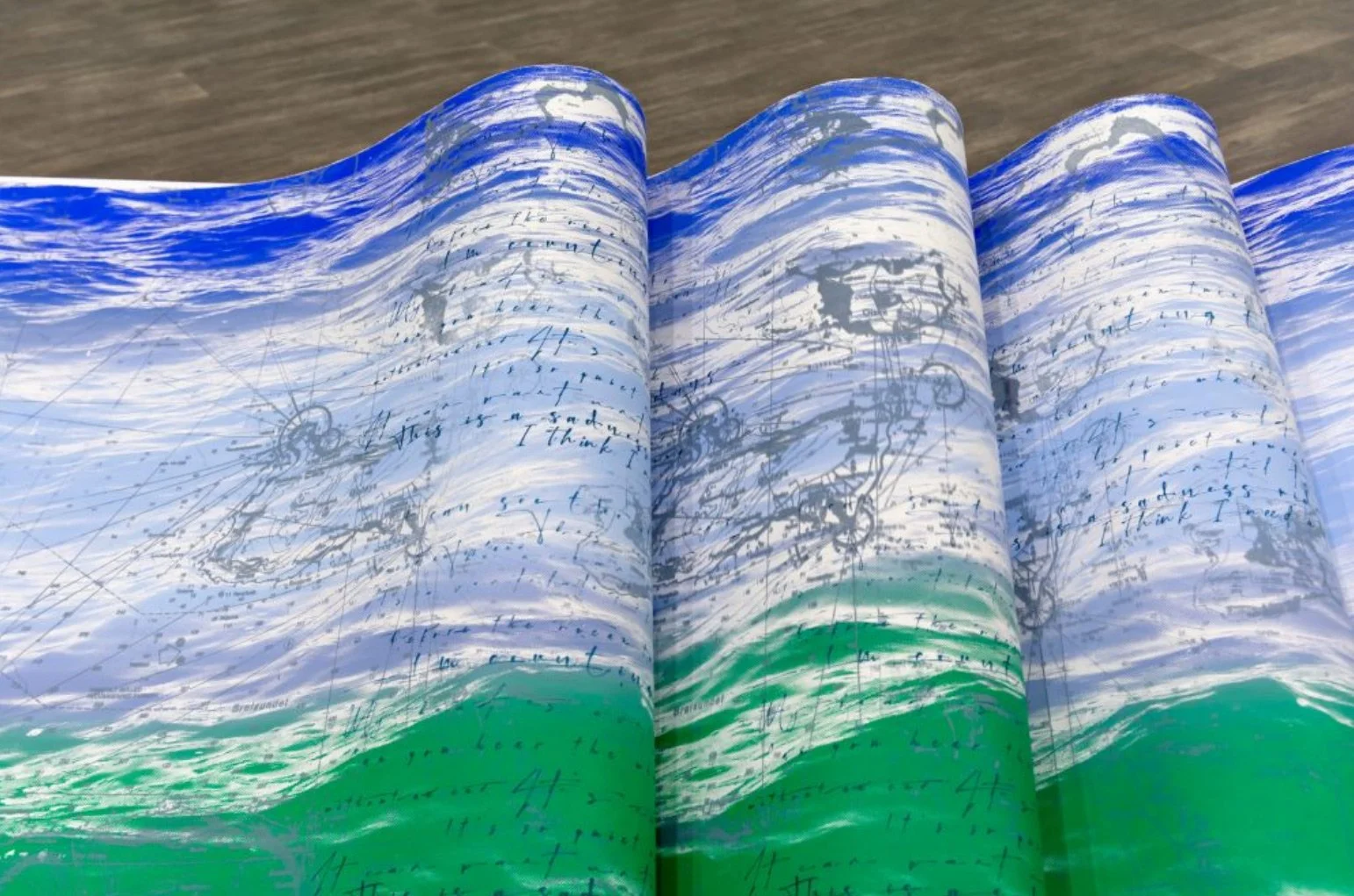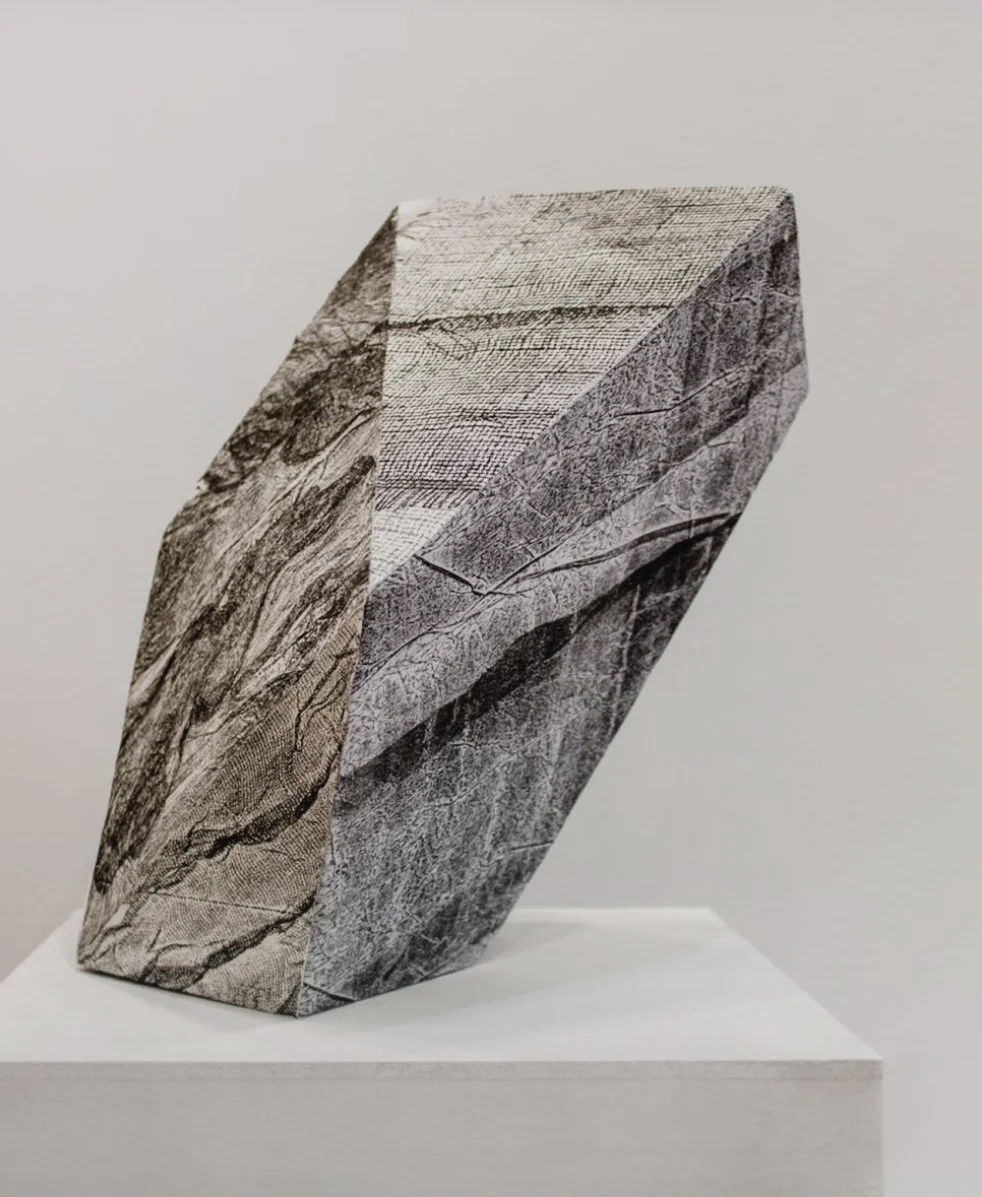 I utstillingen viser hun både tredimensjonale skulpturer av brettet ark som står fritt på gulvet og en som henger montert på vegg.