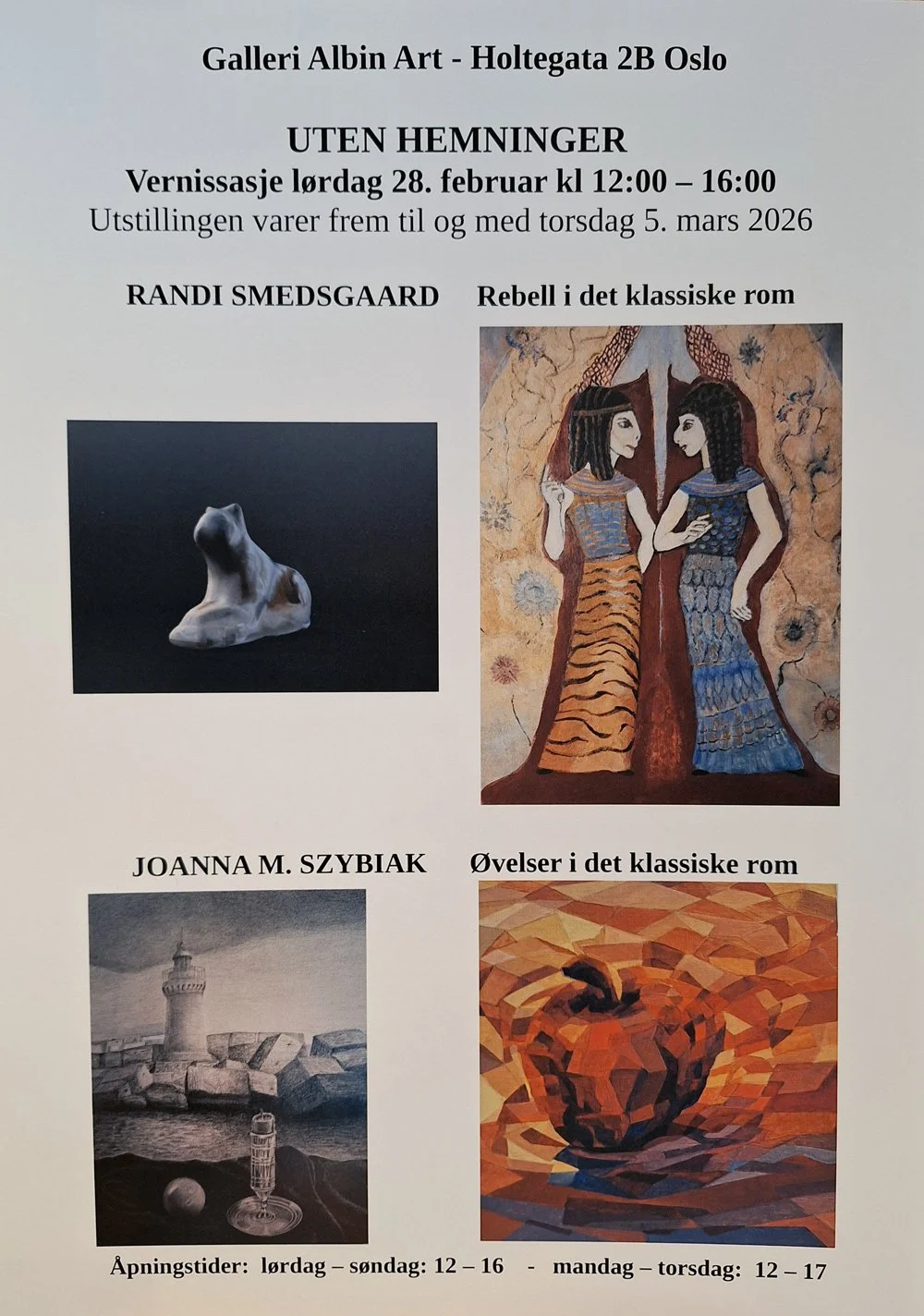 Velkommen til utstillingen Uten Hemninger i galleri Albin Art, Holtegata 2B, Oslo