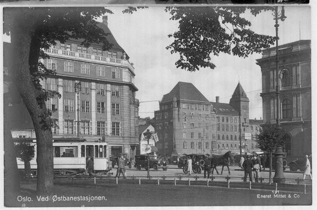 Paléhaven ved Christian Frederiks plass med sikt mot Jernbanetorget. Trikk, hest og kjerre. Amerikalinjens hovedkontor til venstre. Postkort, 131.