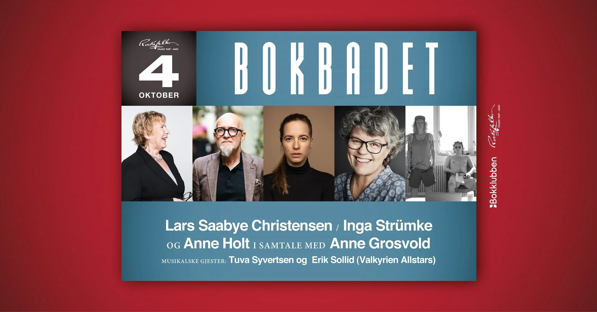 BOKBADET Lars Saabye Christensen, Inga Strümke og Anne Holt i samtale med bademester Anne Grosvold + musikalske gjester: Tuva Syvertsen og Erik Sollid (Valkyrien Allstars)